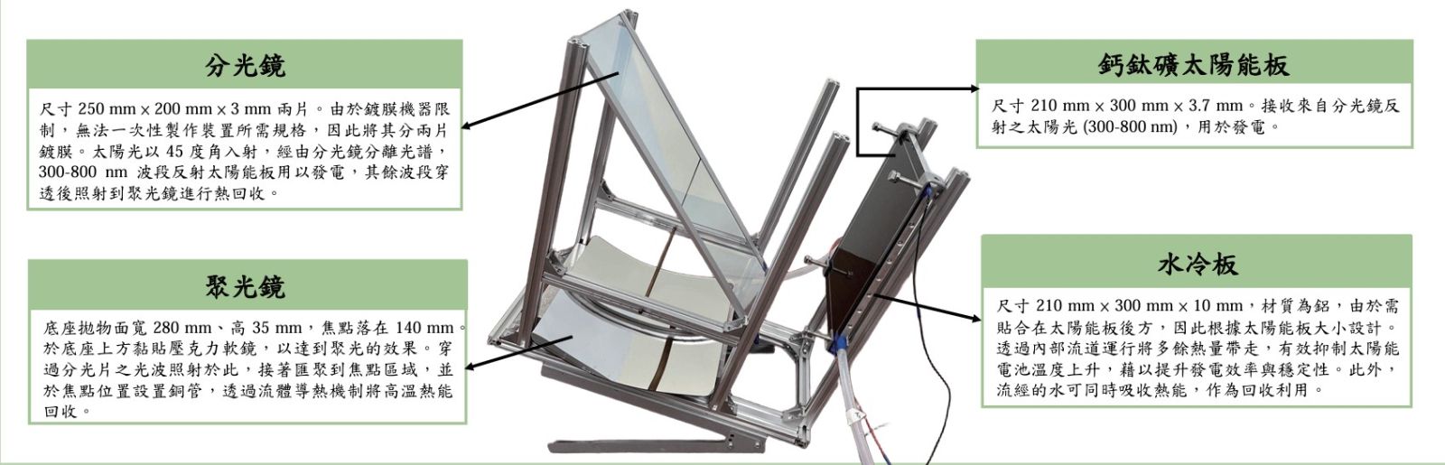 a.發電與熱能並行:本裝置運用分光鏡與聚光鏡技術,將(300–800nm)波段反射至鈣鈦礦太陽能電池產生電能,(> 800nm)波段則用於熱能回收。結合蛇行流道水冷系統可維持電池低溫運作,提高光電轉換效率並回收熱水,實現電熱雙輸出,提升能源利用率。