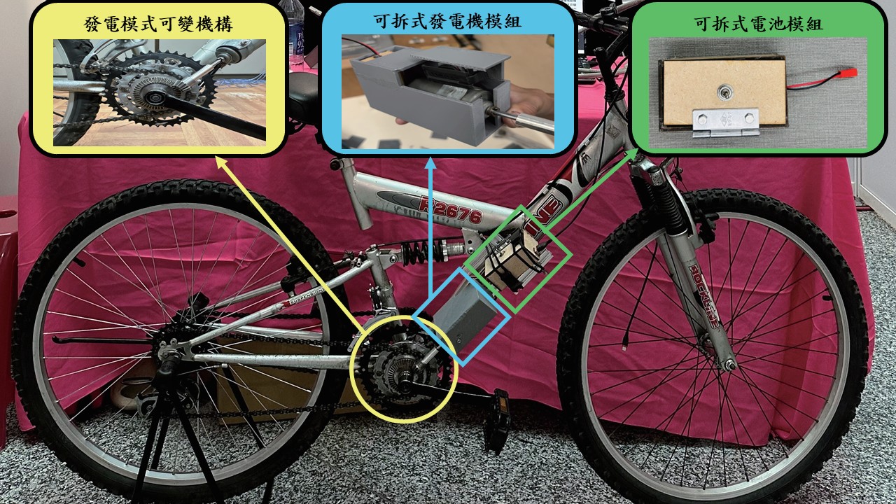 本作品是一套無電控、純機械式的可變動能回充系統,並結合創新的雙側鏈條傳動系統、多檔位切換模式(包含OFF/LOW/HIGH)三種模式可切換、模組化設計(將發電系統、齒盤組、電池組模組化,提升此作品的擴充及應用性)、快拆式設計(將發電機與電池模組設計為快拆結構,使電池模組可作為行動電源使用,並達成防盜的效果)。