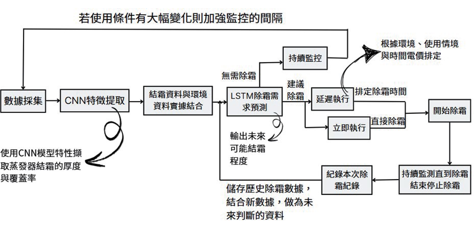 因應電價上漲與淨零碳排需求,本企劃聚焦於超商節能,提出以AI技術優化虛功率補償與除霜控制。方案一透過新增電壓量測設備,結合LSTM模型預測負載並調整電容抗值,提升功率因數、降低線損。方案二以CNN與LSTM預測結霜狀況,並根據使用情境,導入溫冷媒除霜,減少不必要能耗與設備損耗。兩方案可在原系統上加裝,成本低、效益高,有助於節能減碳、提升獲利,並支援未來微電網建置。