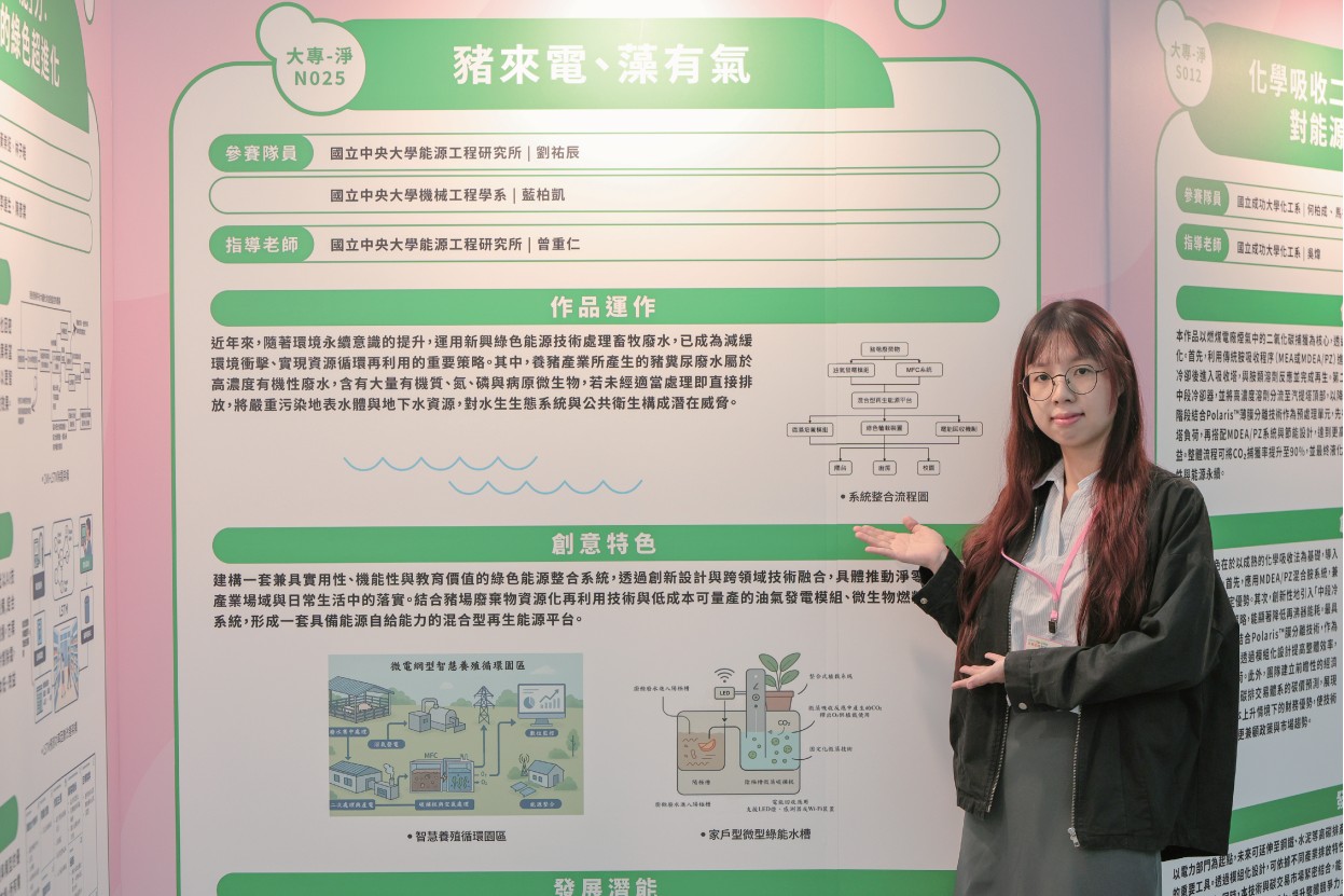 建構一套兼具實用性、機能性與教育價值的綠色能源整合系統,透過創新設計與跨領域技術融合,具體推動淨零排放理念於產業場域與日常生活中的落實。結合豬場廢棄物資源化再利用技術與低成本可量產的油氣發電模組、微生物燃料電池(MFC)系統,形成一套具備能源自給能力的混合型再生能源平台。