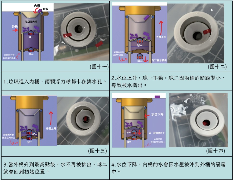 本作品突破傳統需用電的收集裝置,利用自然水波自動運作,實現「無電力驅動」的新概念。藉由內外桶設計與防倒流凹槽,不受水流方向限制,能自動收集漂浮垃圾並維持穩定浮力。