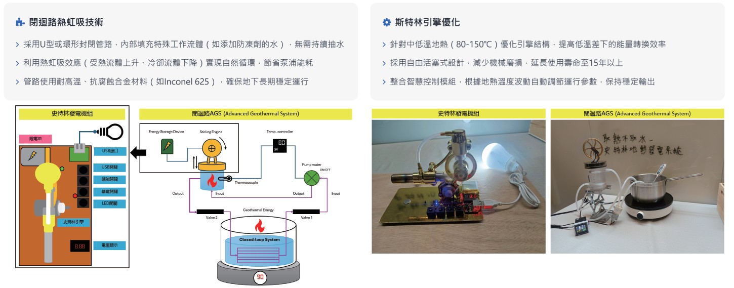 本作品最大的特色在於將地熱封閉迴路與史特林引擎兩種概念首度結合應用。相較傳統地熱須抽取地下熱水,本設計完全零取水,屬於全新的地熱利用模式,充分展現創新性。在國內屬首創概念,國際上也僅有少數公司研發閉迴路地熱技術,但一般多配合有機朗肯循環發電;將Stirling外燃機引入地熱領域更是少見,具相當原創性。另外,強調小型在地發電,適合偏遠社區使用,走出傳統大型電廠的框架。